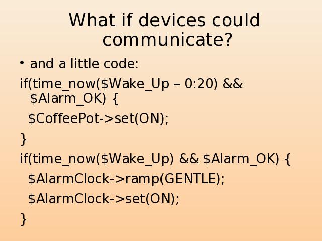 Some simple Perl code that could be used by Misterhouse. Of course this assumes that the correct modules have been written before hand. Such as the Mr. Coffee module and Alarm Clock modules. Once this has been written then making use of these modules is much easier.