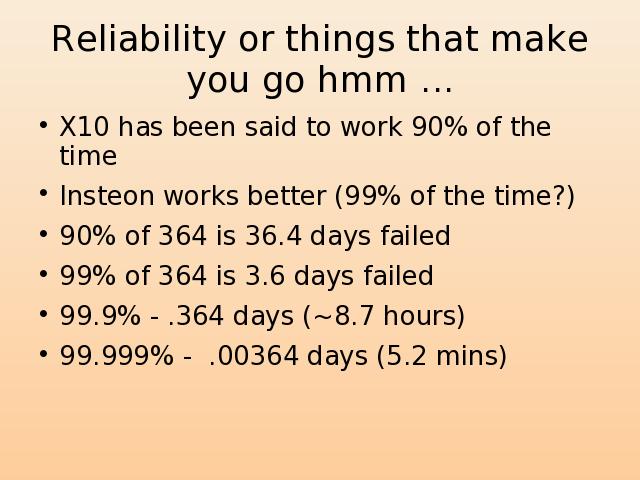 While not strictly part of home automation, a rather important point to take into consideration when dealing with reliability. Some folks say that X10 works 9 out of 10 times. While I agree with the 90% number I don't agree with the 9 out of 10 times. I tend to see X10 and my other HA product work in long spurts with short bursts of failure.