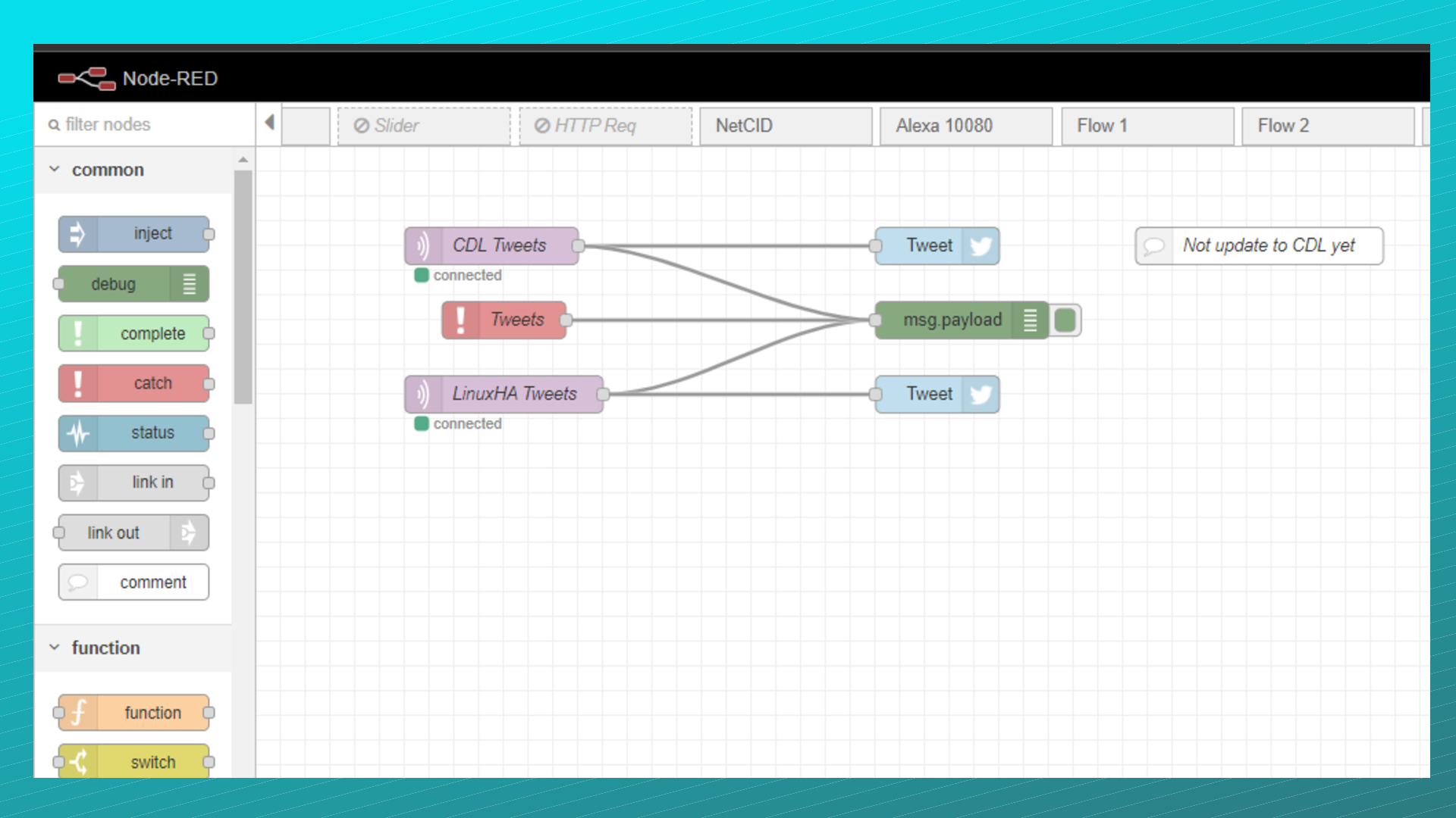 Here I have 2 MQTT in nodes (Purple), 2 Twitter out nodes (blue), 1 error catch node (red), one debug node (green) and one comment node (white).