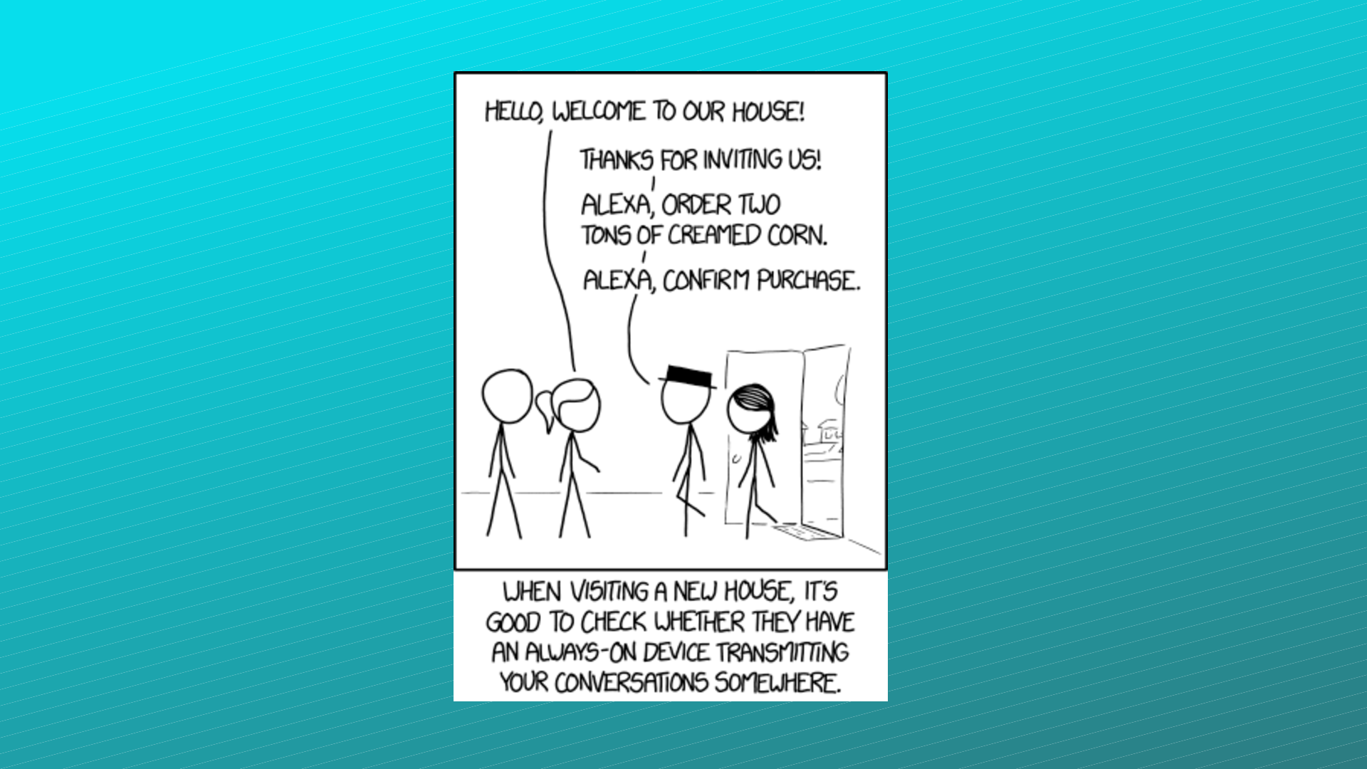 This comic depicts Cueball and Ponytail welcoming Black Hat and Danish to their house. Black Hat immediately talks to Amazon Alexa to order two tons of creamed corn. This would be quite expensive (around $10,000), and the hosts would be charged because it was ordered on their Amazon Echo device. It would also be a serious inconvenience, as the purchase would be quite bulky and useless, seeing as an average person would have very little use for two tons of creamed corn.