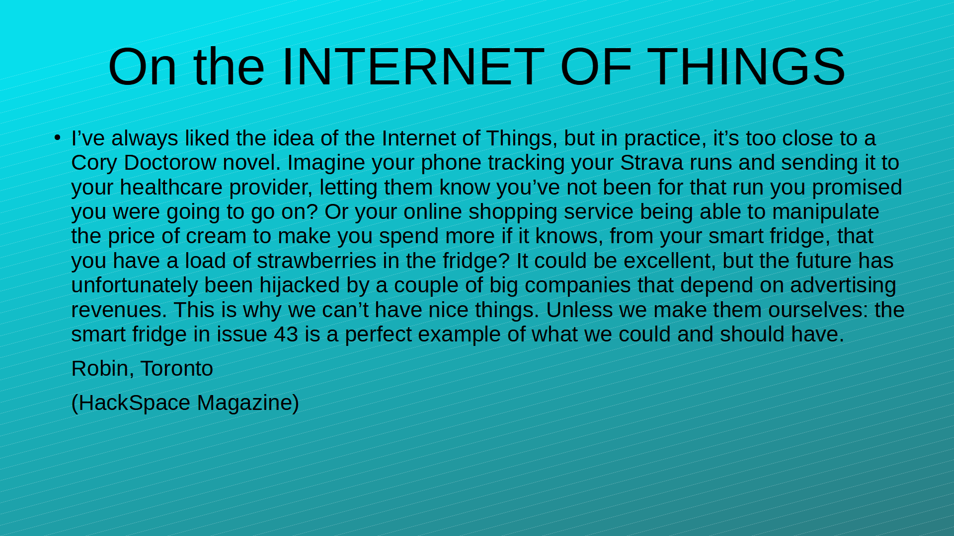 I’ve always liked the idea of the Internet of Things, but in practice, it’s too close to a Cory Doctorow novel. Imagine your phone tracking your Strava runs and sending it to your healthcare provider, letting them know you’ve not been for that run you promised you were going to go on? Or your online shopping service being able to manipulate the price of cream to make you spend more if it knows, from your smart fridge, that you have a load of strawberries in the fridge? It could be excellent, but the future has unfortunately been hijacked by a couple of big companies that depend on advertising revenues. This is why we can’t have nice things. Unless we make them ourselves: the smart fridge in issue 43 (10 IoT Projects – Pg 47) is a perfect example of what we could and should have.