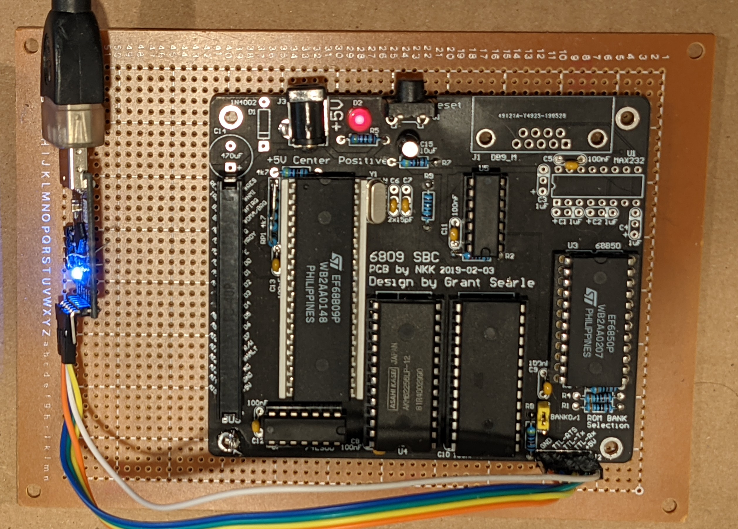 I built a 7 chip Grant Searle's 68B09 SBC, pretty isn't it? You can't see the PROM chip very well but it's a 28F256 that I'm only using the upper hald at this time. I'm powering the SBC off the 5V from the CH340 USB TTL Serial dongle. This one happens to be a direct connect to the USB's 5v0 line. Not all USB Dongles have that. Many have e current limiting resistor on the 5V and can't supply enough current to run the board. You'll need to check for that or provide external power.