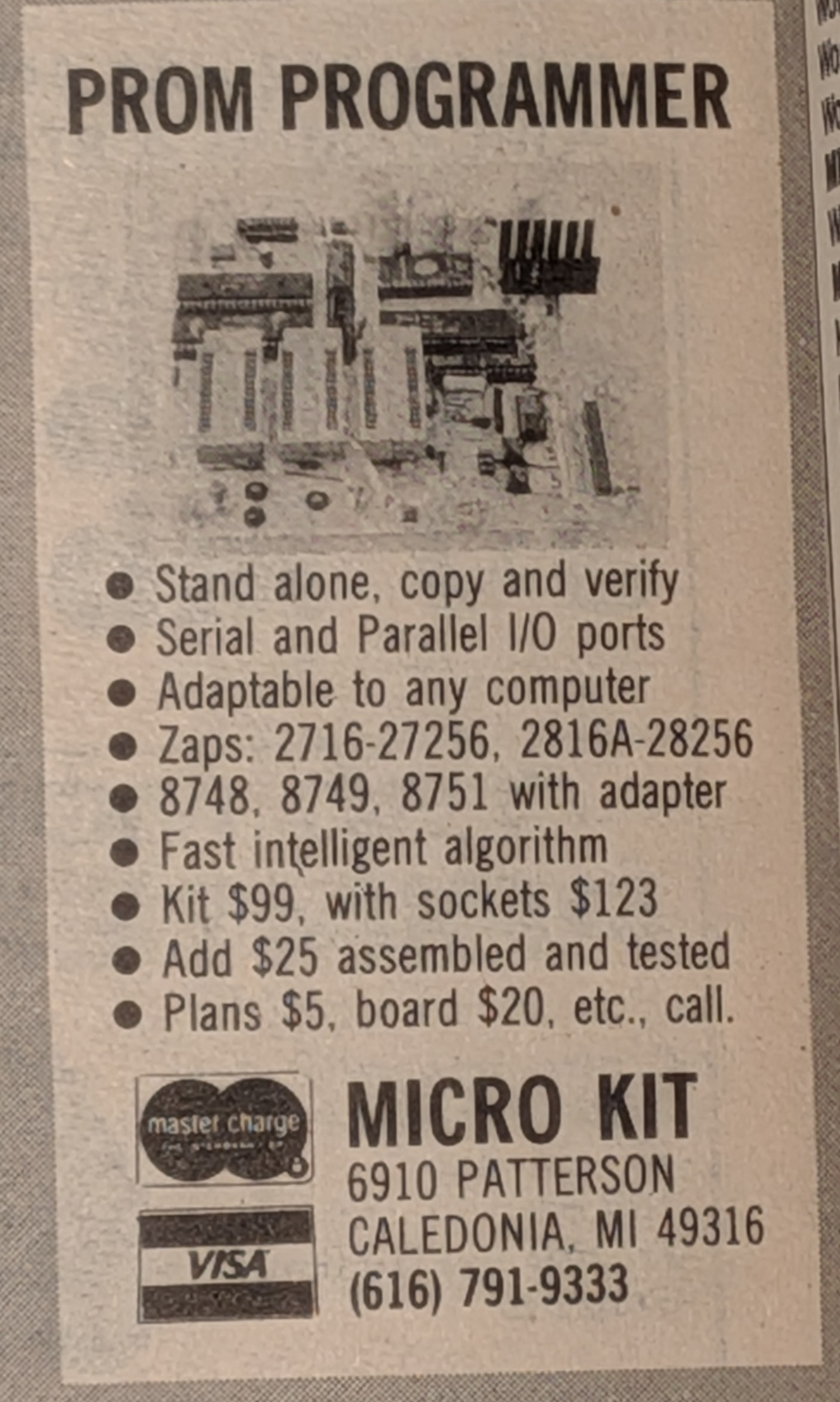 Well I seem to be lucky. I was checking out the back sections of the Februrary 1987 Computer Shopper and found the Micro Kit ad.